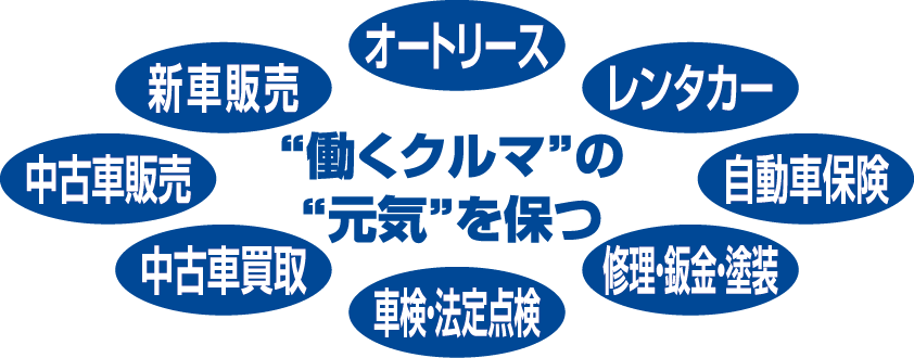 オートリース、車両販売、車検・整備、買取、鈑金塗装、レンタカー、自動車保険など、「オートアフターマーケット」における幅広い業務を通じ、お客様の利用状況や経営スタイルに応じた最適なクルマとの関わり方をご提案しています。